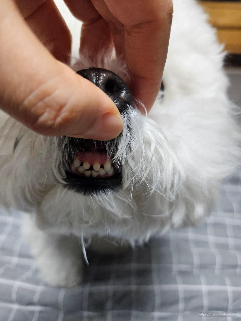 - 송곳니는 길고 음식물이 남기 쉬우나, 강아지가 비교적 잘 보여주어 중간 단계에 적합