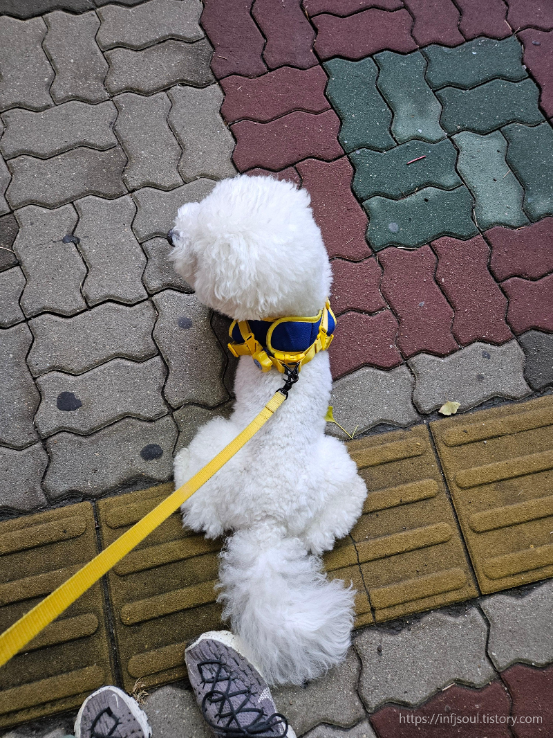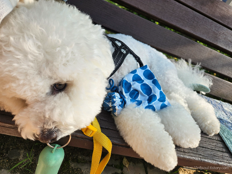 - 산책 도중 자주 수분을 보충해줘야 하므로, 휴대용 물통과 간식을 꼭 챙겨 다니세요.