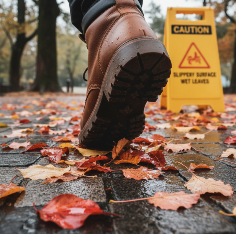 젖은 낙엽, 서리가 녹은 산책로, 야자 매트 위에서도 순간적으로 균형은 무너질 수 있습니다.