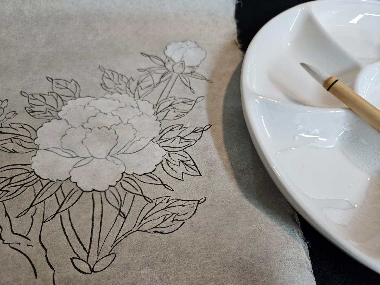 (3) 선긋기(윤곽선 작업): 연필 또는 연하게 푼 먹물로 윤곽선을 그립니다.