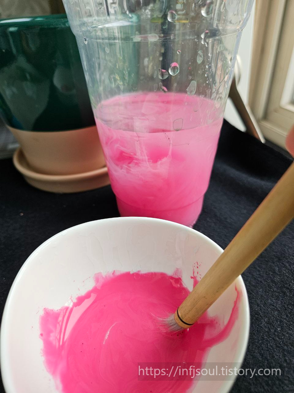 붓을 물에 헹굴 때 퍼지는 분홍빛조차 아름다워, 그 색감 하나로 몰입이 되더군요.