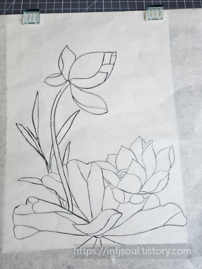 연꽃 민화를 그릴 때 가장 중요한 것은 도안과 종이의 고정입니다.