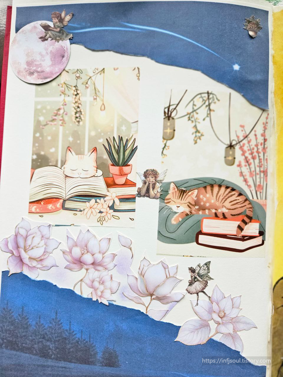 책과 쿠션 위에서 편안히 잠든 고양이, 그리고 꽃과 나비, 요정 스티커로 장식했어요.