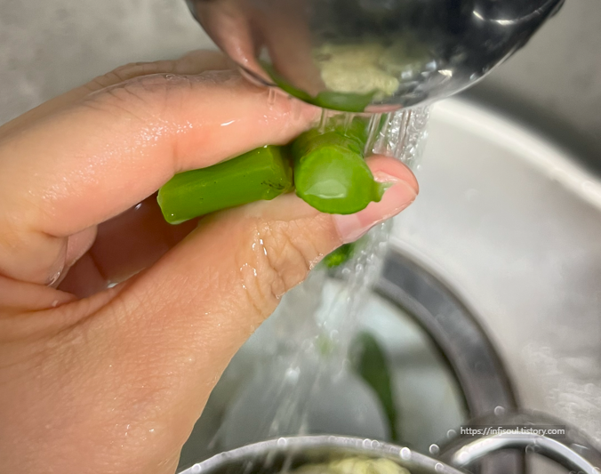 2) 끓는 물에 줄기 먼저 넣고 30초간 데치기