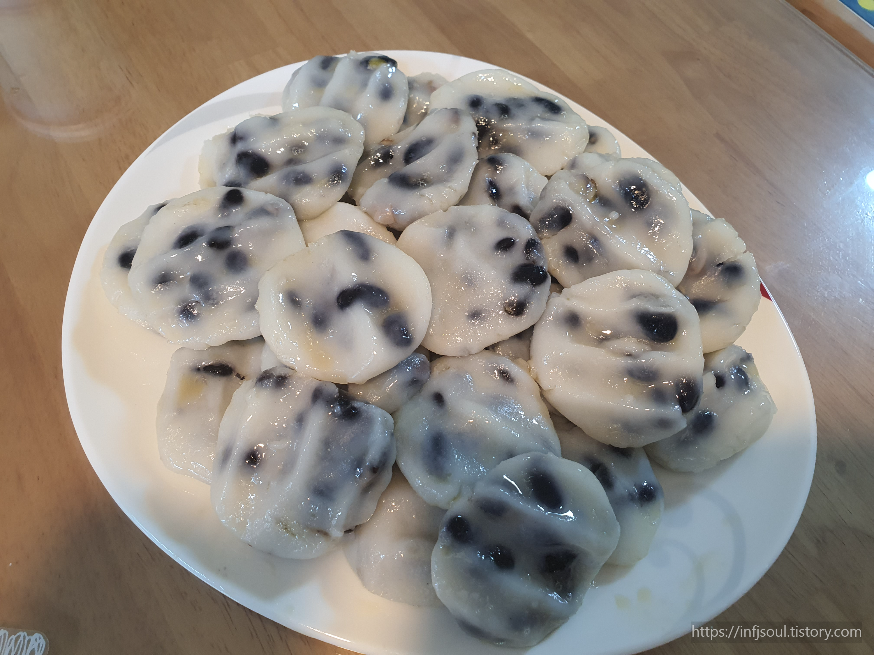 - 검은콩 소: 하룻밤 불린 뒤 삶아 사용합니다. 껍질을 벗기지 않아도 되며, 껍질째 쓰면 영양이 그대로 남고 씹는 맛이 좋습니다. 다만, 부드러운 식감을 원한다면 껍질을 벗겨 사용하는 것이 좋습니다. 소금 간을 살짝 하면 담백한 풍미가 살아나요.