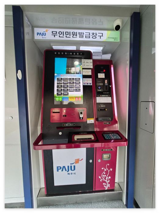 즉, 파주시민이라면 누구나 무인민원발급기를 통해 주요 민원서류를 무료로 발급받을 수 있습니다.