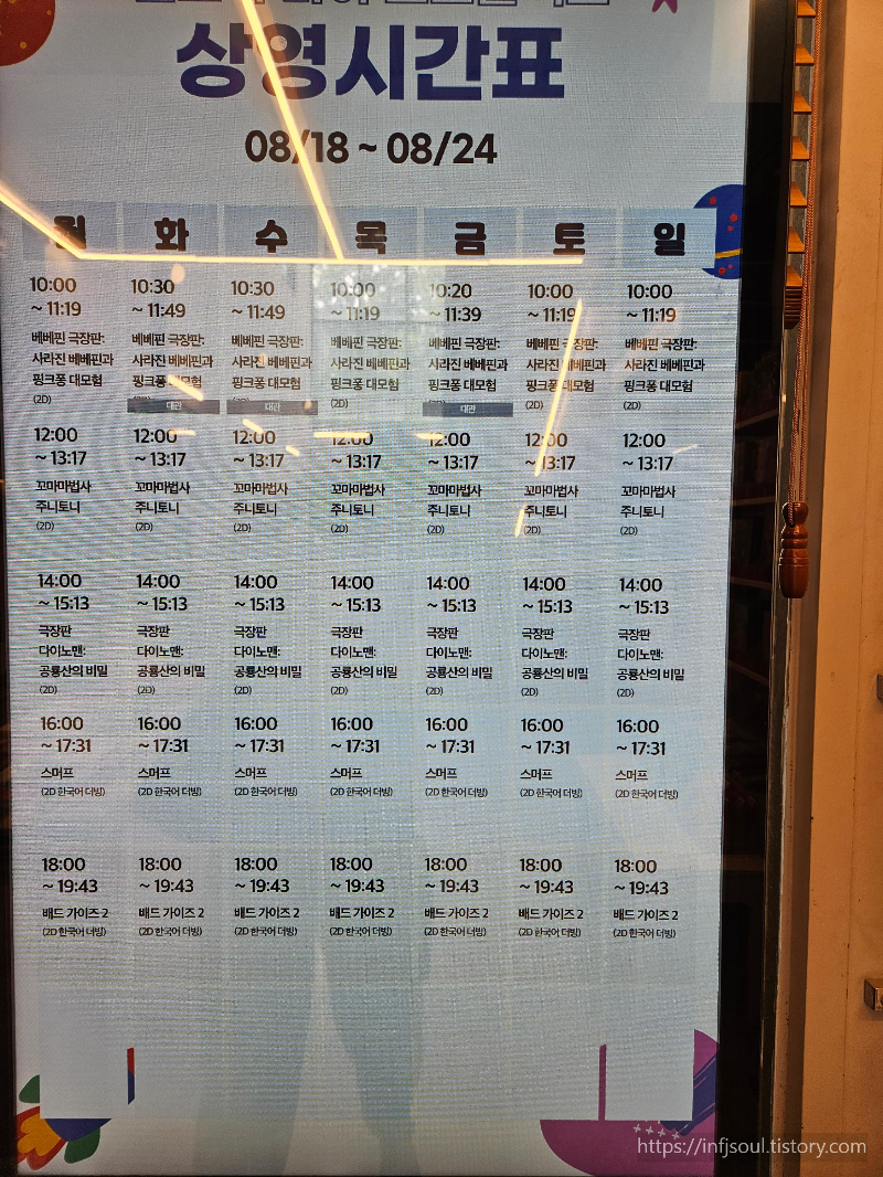 스머프, 배드가이즈2, 핑크퐁 대모험 등 가족 단위로 즐길 수 있는 작품들이 상영 중입니다.