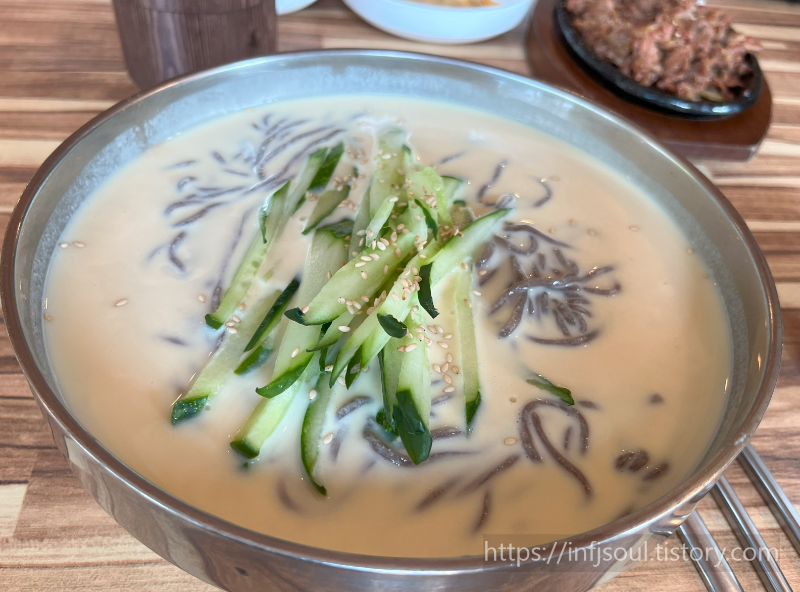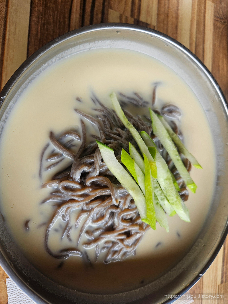 진한 콩물에 모밀면, 오이 고명이 올라가 고소하면서도 시원합니다.