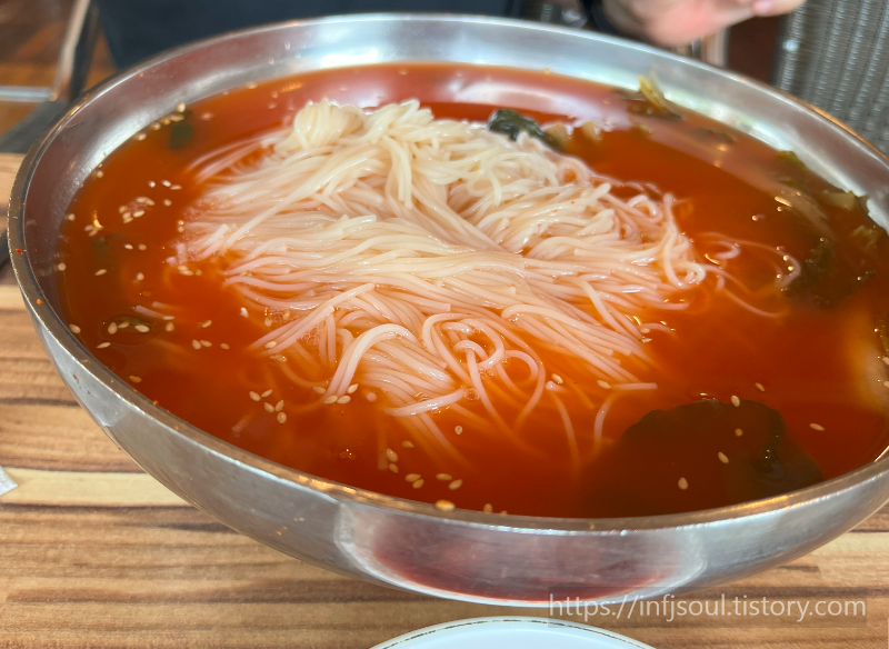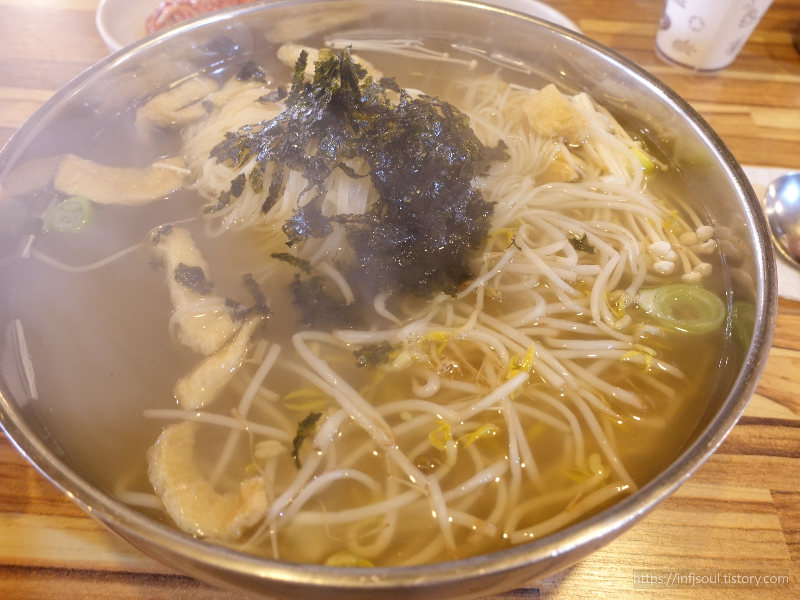 멸치 육수에 숙주나물이 들어가 시원하면서도 담백한 맛을 내고, 양념장으로 간을 맞춰 먹을 수 있습니다.