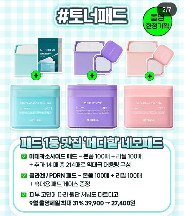 1. 메디힐 네모패드 (흔적/모공/콜라겐) 100매