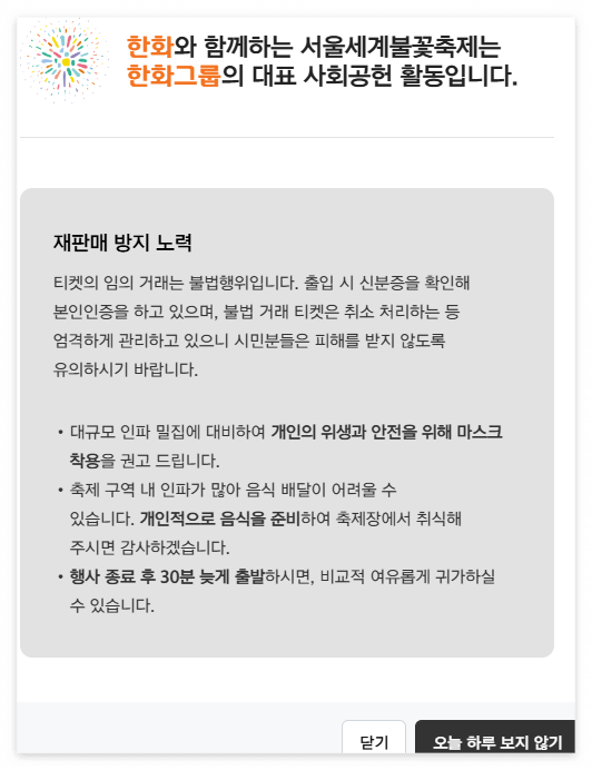 - 귀가 시 분산 이동: 불꽃 종료 직후 대규모 인파 몰림 → 30분 지연 후 이동 권장